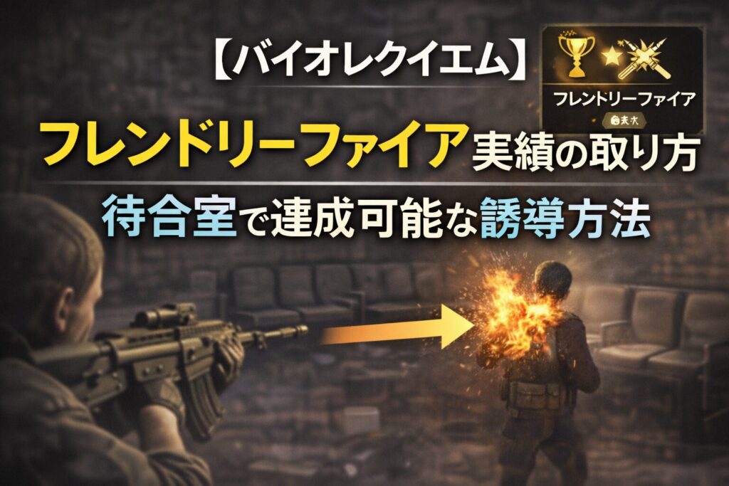 『バイオレクイエム』の実績「フレンドリーファイア」は、ゾンビ同士を戦わせて撃破させる特殊条件が必要になります。待合室周辺で達成しやすい方法や、空き瓶を使った誘導手順など、プレイヤー間で共有されている攻略情報を整理します。